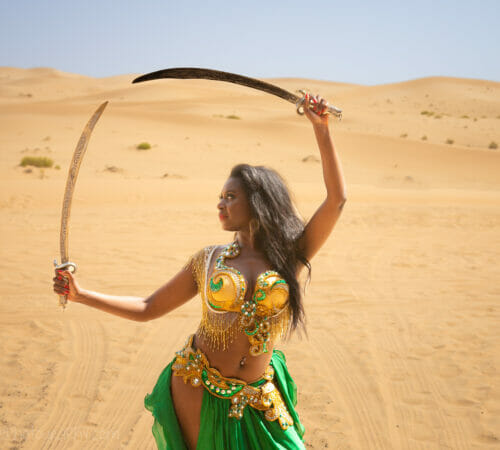 The sword dance is a mysterious and earthy dance that is very dramatic and of great impact. Great for stage or ‘dance floor’ areas where the audience isn’t too close to the performer.